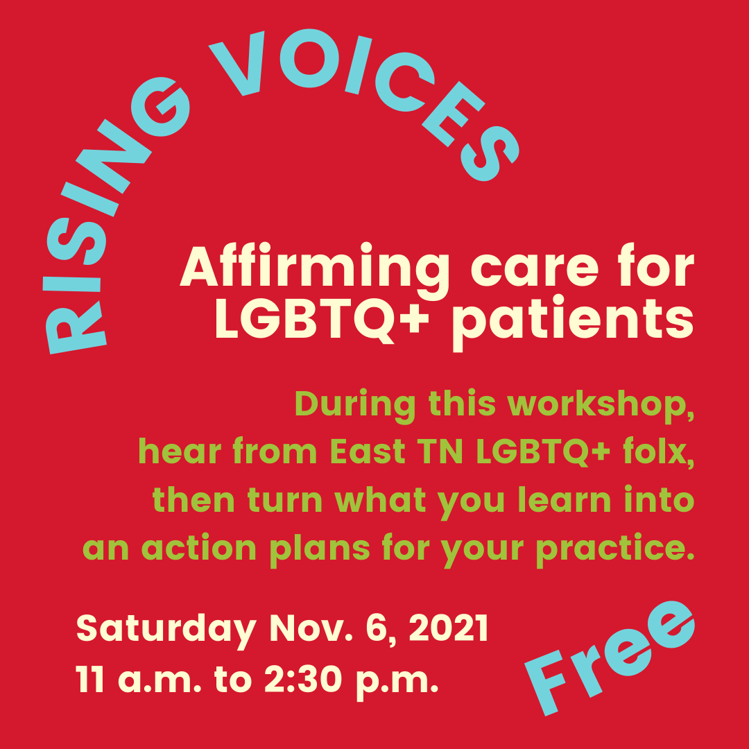On Saturday, Nov. 6 from 11 a.m. to 2:30 p.m., Lincoln Memorial University’s (LMU) medical grad student-run Sexuality and Gender Equality (SaGE) Club is sponsoring the workshop: “Rising Voices: Affirming Care for LGBTQ+ Patients” facilitated by RISE: Healthy for Life. This workshop is free and open to all LMU students, faculty, staff, and alumni, and it will open to folx outside the LMU community on Oct. 25.